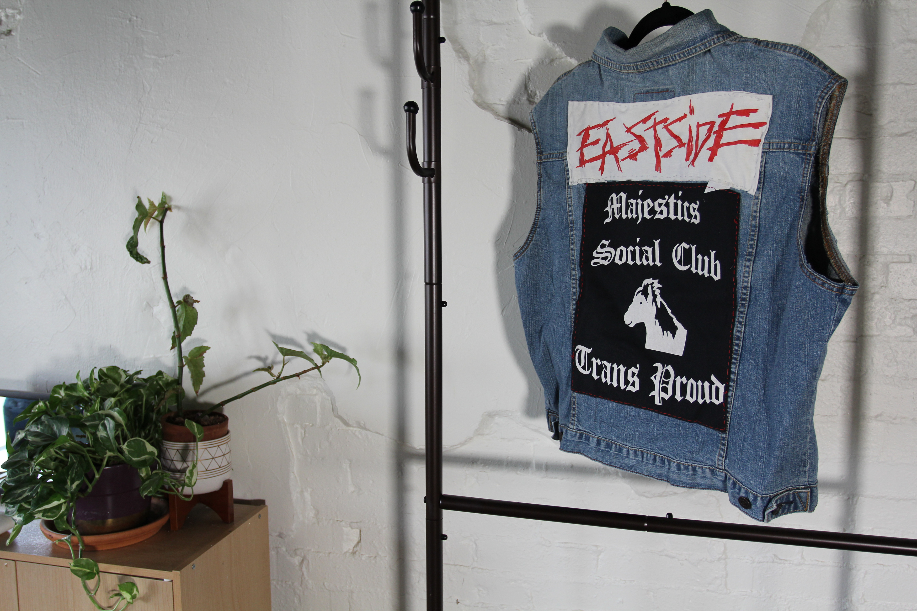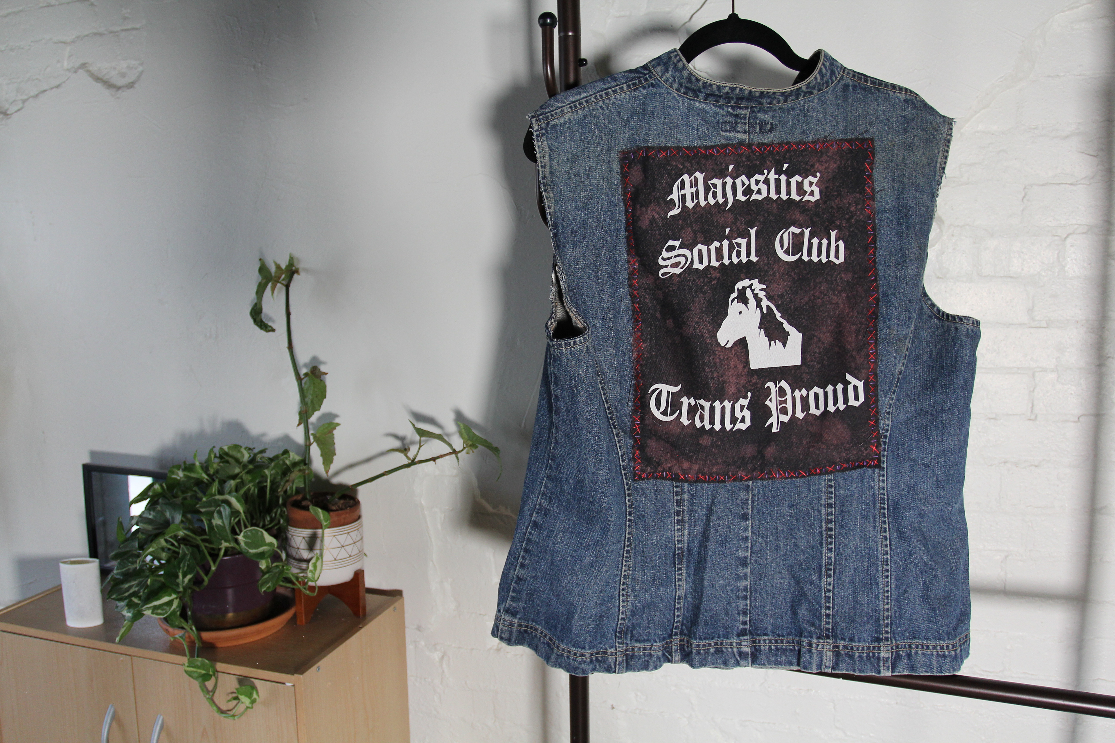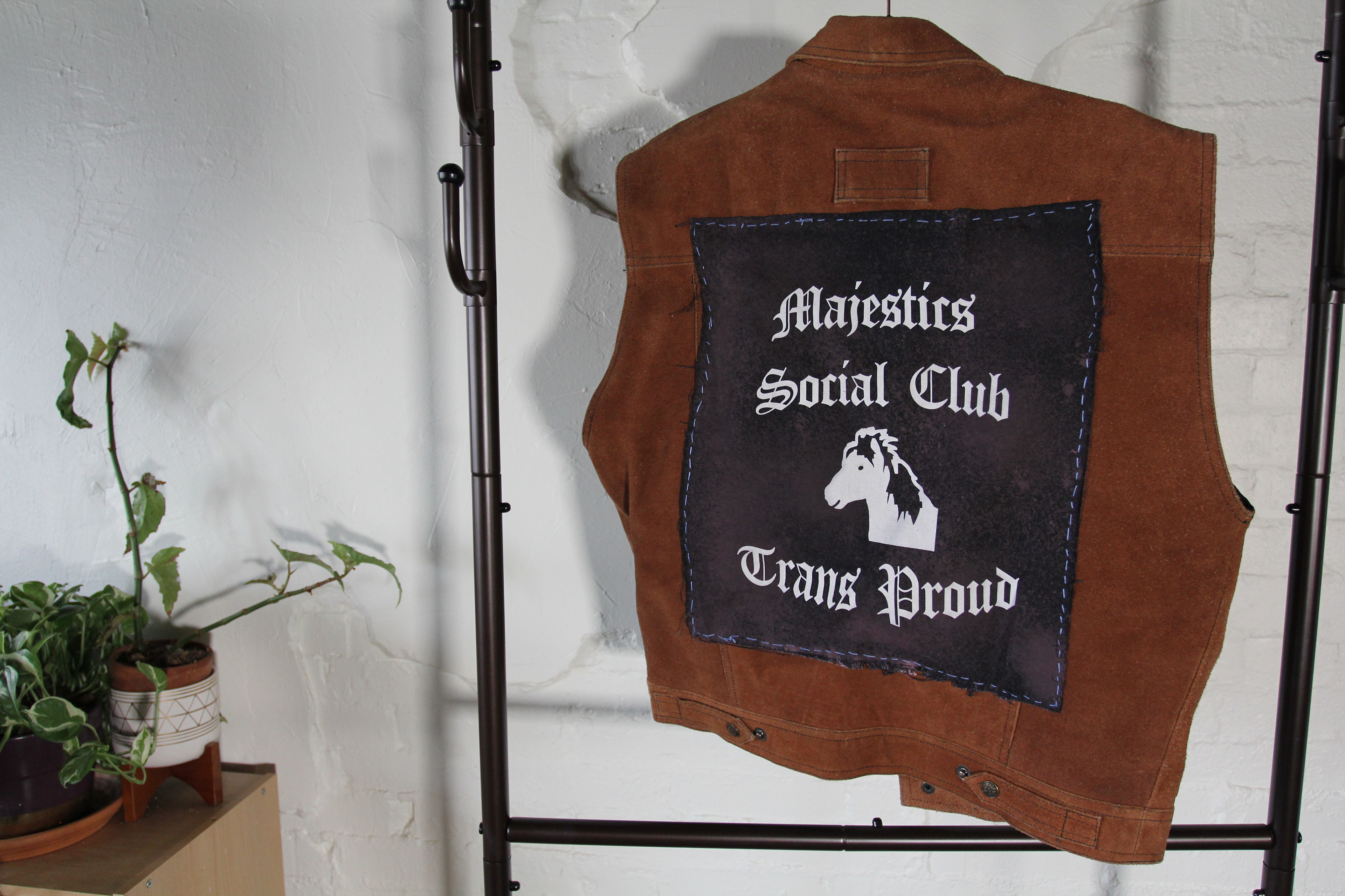 I don't remember deciding to make club jackets, rather it seemed like something I had been doing for quite some time. I would make back patch vests for friends, for a birthday or moving away gift, for myself when I needed something new or fun to wear. I’d cut up a t-shirt or pull patches from unrelated organizations. Part grunge, part punk, these practices had the visual markers of life that sounded with me, working class, regional aesthetics, local jokes, small town celebrity illustrations. The non-standardization of it all, and the crap sewing skills I applied to boot. As a punk, we used our backs like anti adverts, claiming the last unsellable space for self expression and tribe identification. As a queer punk, the jacket or the vest felt as sacred as bikers colors. A friend once thought I was handling their vest like it was untouchably dirty, but really, I was feeling a reverence for how much it seemed to hold their body, aura, toughness, and pockets full of useful things: beer, tobacco, keys, handkerchief, scraps of paper, drugs.